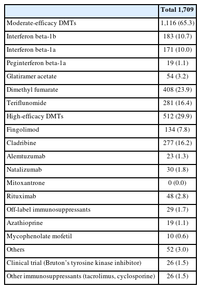 Type of disease-modifying therapies (DMTs) currently used in South Korea patients with multiple sclerosis